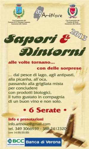 Leggi TuttoInizia questa sera con il pesce di acqua dolce la rassegna Sapori & Dintorni. L'associazione ArtNove dopo il successo delle prime tre edizioni, con il patrocinio dei Comuni di San Giovanni Lupatoto e Zevio, rilancia per il quarto anno la rassegna Sapori & Dintorni che si svolgerà tra settembre e novembre 2013
